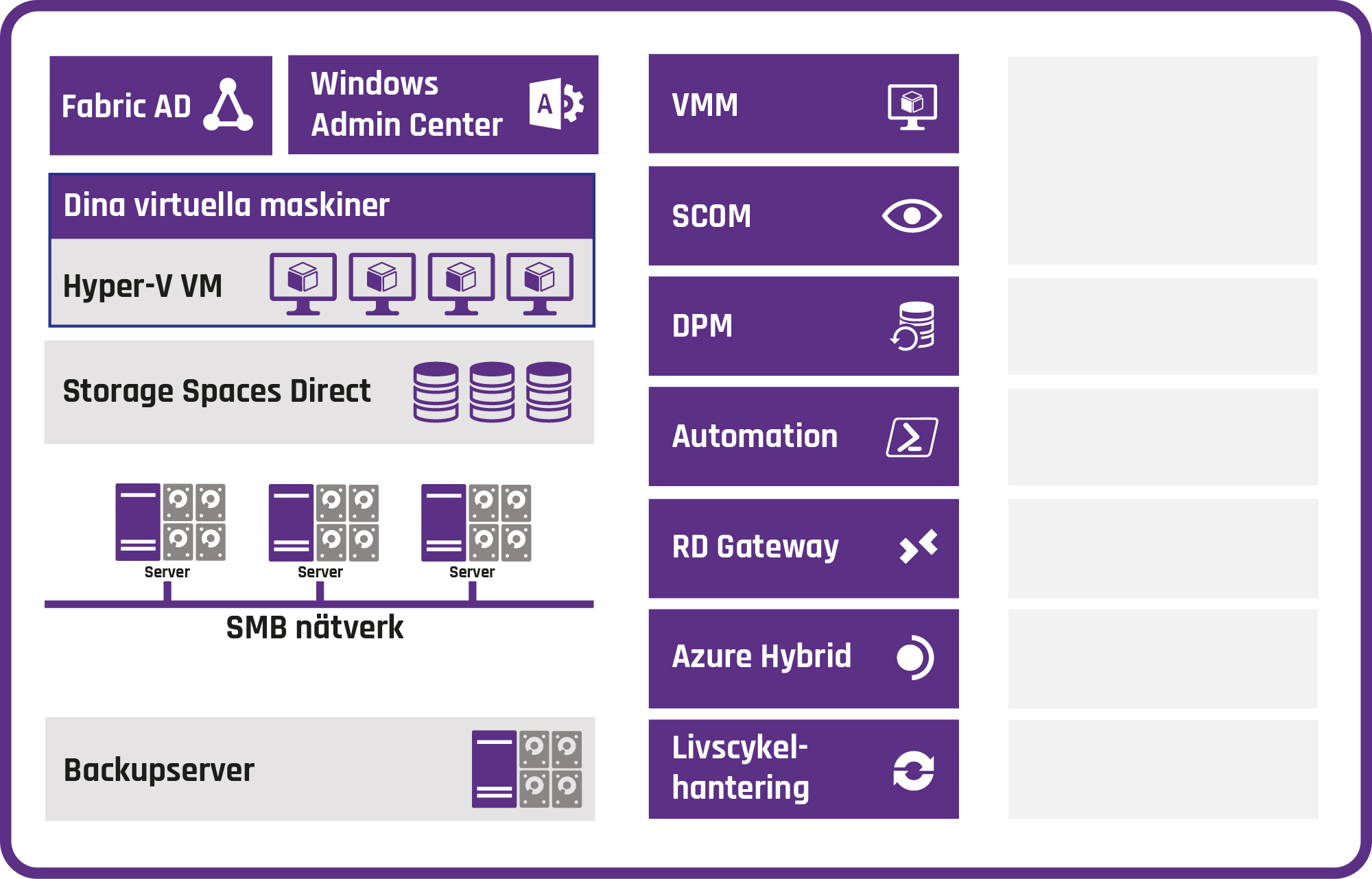 - Enkel hantering. Vi lägger till verktyg för att hantera virtuella maskiner, övervakning, patchning och backup till din HCI.